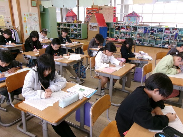 算数では、たし算やひき算の基礎的な問題に繰り返し取り組んでいます。子供たちは、一秒でも早く、正確に解こうと真剣そのものです。