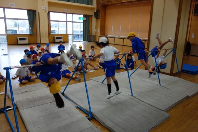 鉄棒の学習の様子。何度も練習しましょう。
