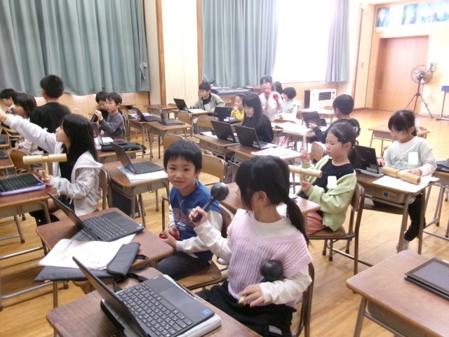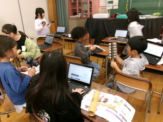 音楽では、自分たちで考えたリズムで「音楽」をつくり、いろいろな楽器をつかって演奏しています。今日は、どの楽器を使ったら自分たちの考える音になるか、ためしながら演奏していました。