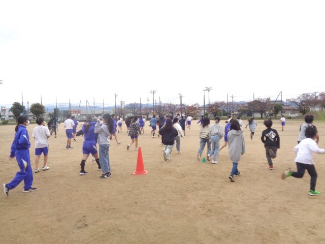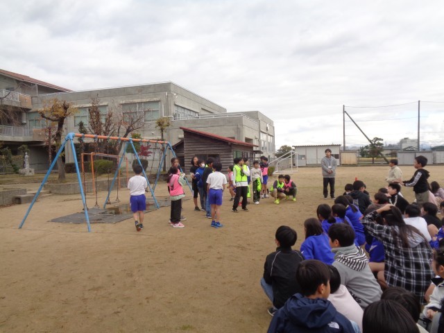 肌寒い中でしたが、子供たちはハンター役の子供たちや先生から逃げて、体をあたためていました。
