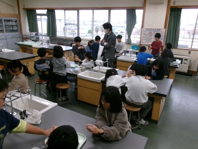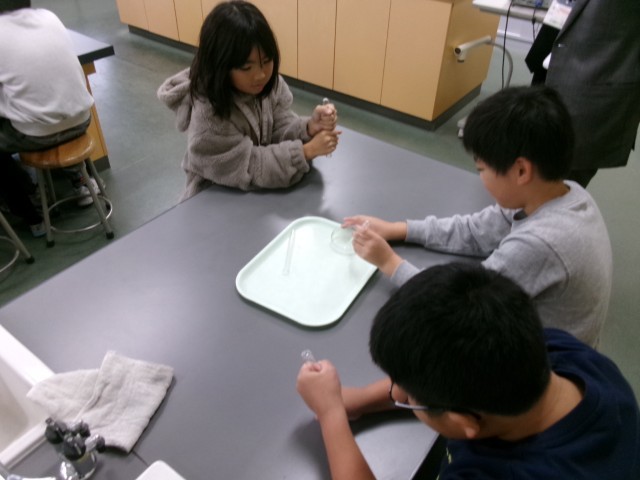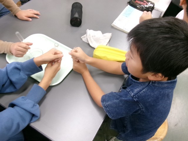 理科の授業では試験管の口に石鹸水をつけ、試験管を手で温めるとどうなるのかを実験しました。それぞれが一生懸命試験管を温める姿や、うまくいかず試行錯誤する姿が見られました。