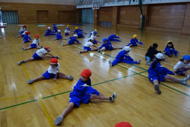 学年体育の学習の様子です。ウォーミングアップの様子です。