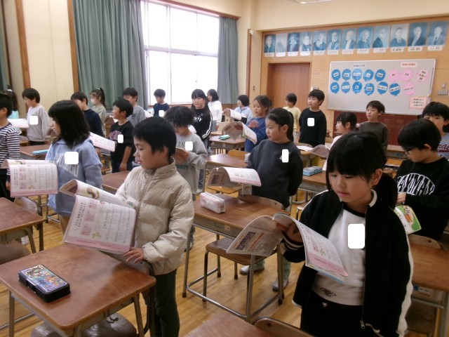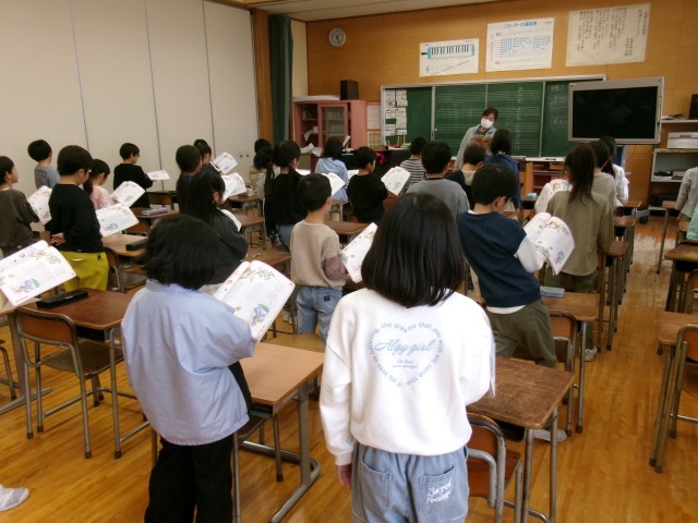 先生に、声の出し方や教科書の持ち方の指導を受けたのち「あのね、のねずみは」を歌いました。その元気で美しい歌声に感嘆し、聴き入ってしまいました。