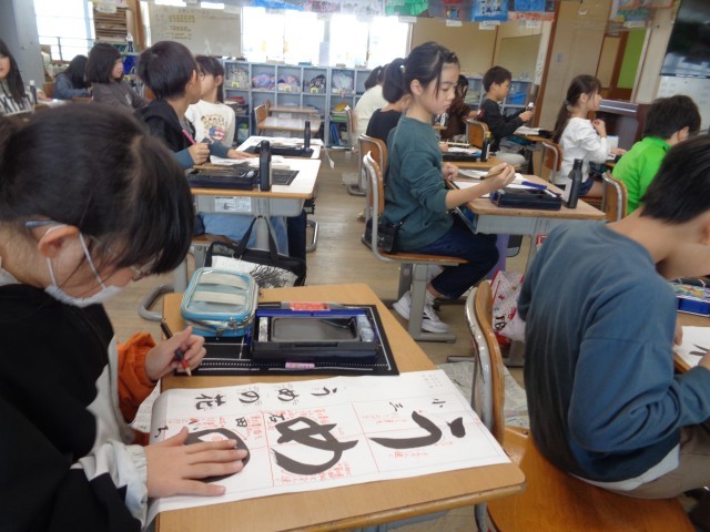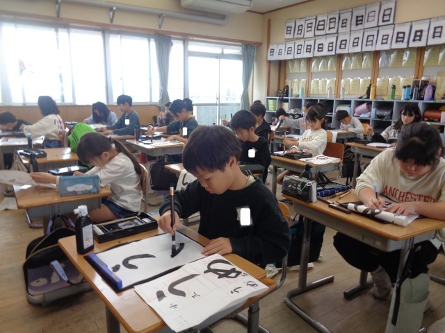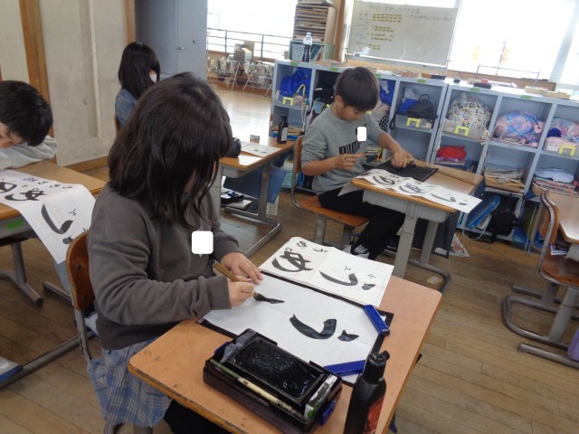 今日は、書く時のポイントを確認してお手本を見ながら半紙に「うめ」を書きました。