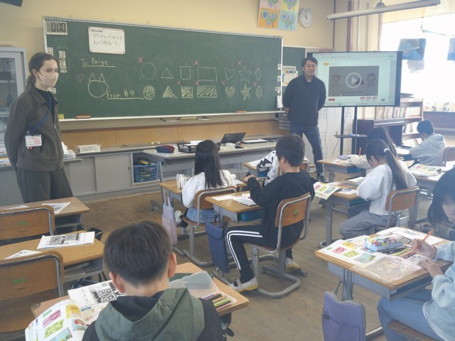 ALTの先生にグリーティングカードを送るために、先生の好きな物の形や色を聞き取り、カードに描く学習に取り組みました。