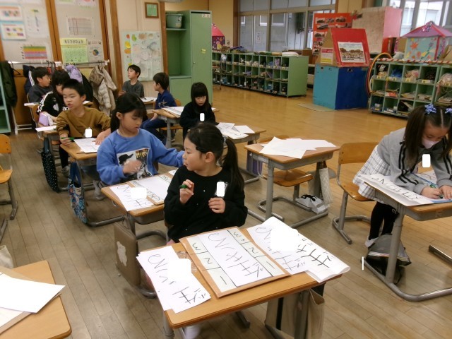 1月の書き初め大会に向けて、硬筆墨で「生きる」の練習を始めました。字形をとるのに苦戦していた子供たちですが、大きく勢いのある字が書けていました。これから、たくさん書き込んでいきたいと思います。