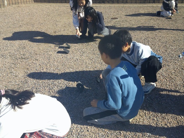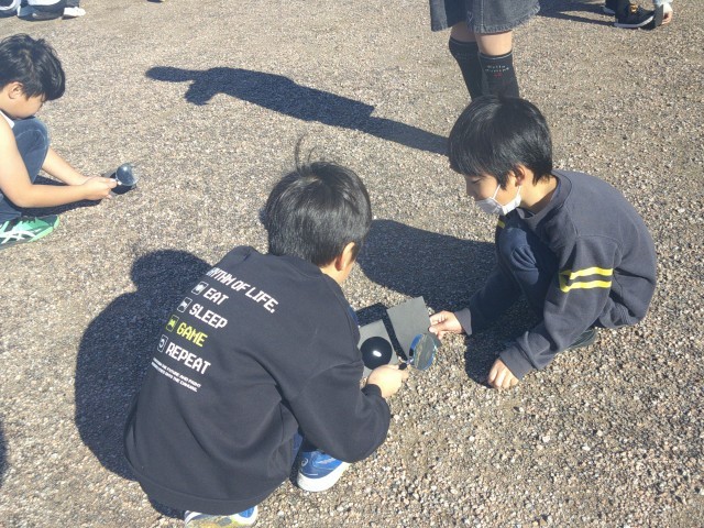 子供たちは、気を付けることをしっかり守って虫めがねで日光を集め、紙が本当にこげることに驚いていました。