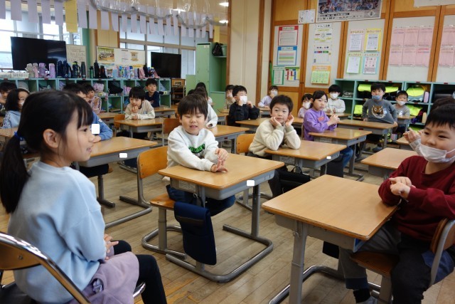 朝の聴き合いの様子です。今日の話題は、「虹」。虹が見えるとラッキーな気持ちになるのだそうです。子供たちからは共感的な意見が出てきました。