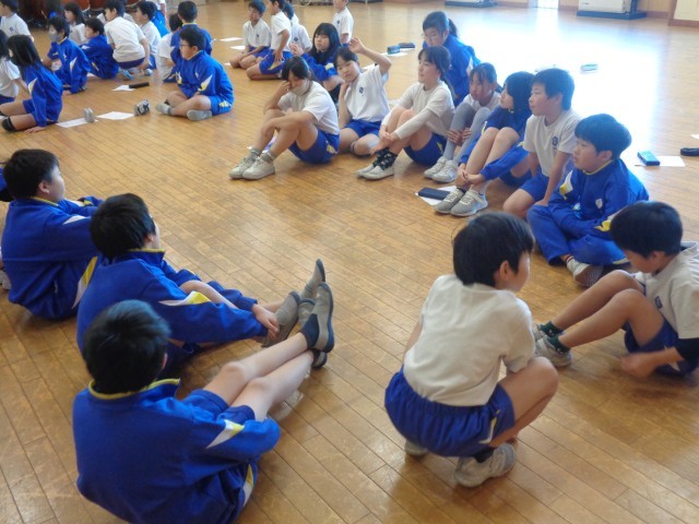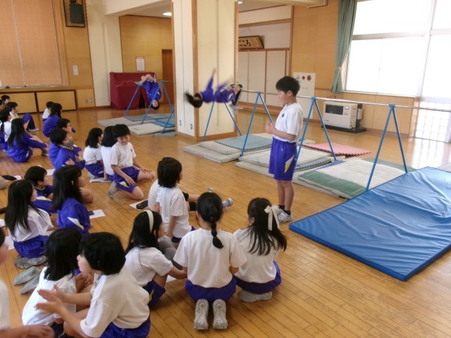 今日は鉄棒の中間発表会を行いました。グループに分かれ、今まで一緒に取り組んできた友達に自分が考えたつなげ技を披露しました。友達の意見を見て感じたことや、やってみて感じたことを全員で共有し、鉄棒や友達と関わろうとする姿がたくさん見られました。