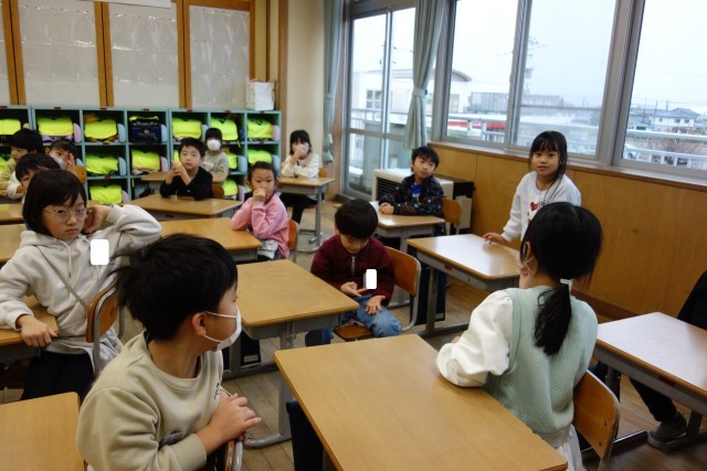 朝のききあいの様子です。自己の生活経験と結び付けながら、友達の話題に耳を傾けます。