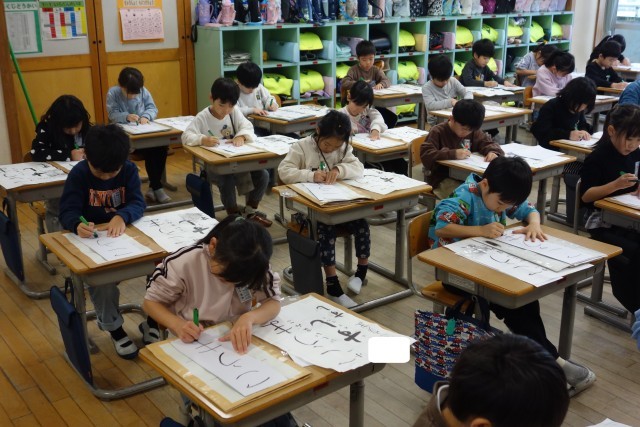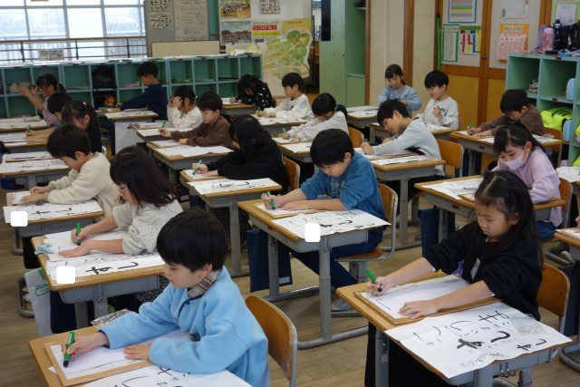 書初大会の様子です。新年の意気込みを文字に表しまず。これまでの練習のを生かし、一字一字丁寧に書く1年生でした。どの子も立派な字を書くことができました。