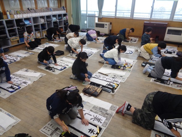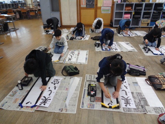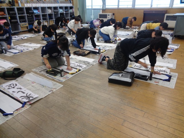 新春のすがすがしい気持ちを筆に込め、「美しい空」を書きました。これまでの学びの成果を発揮しようと、落ち着いて取り組みました。