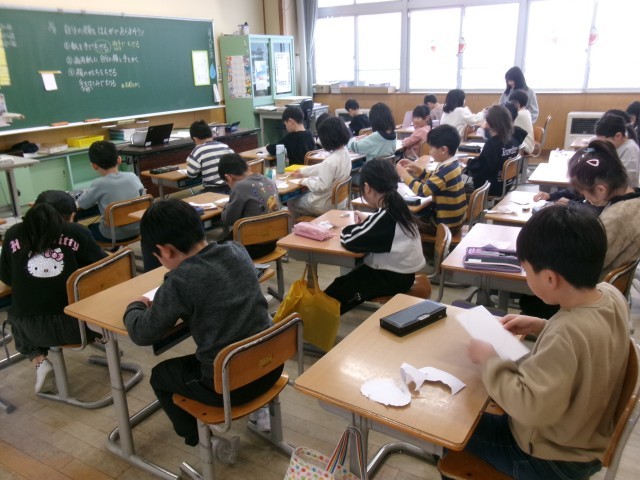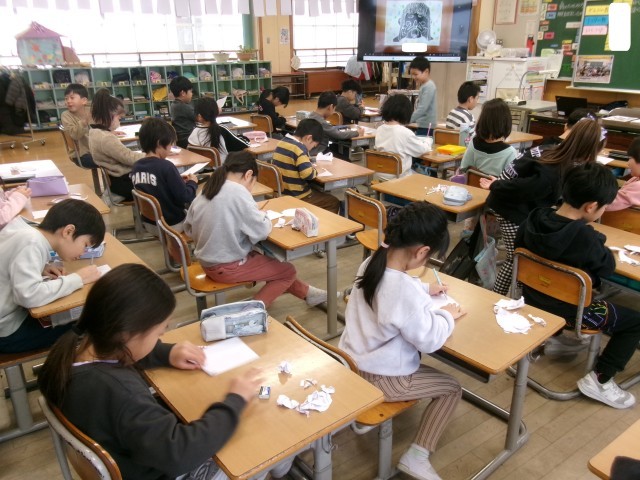 3学期の図工は、紙版画がメインです。今日は、顔の輪郭を作るために「紙をちぎる」練習をしました。小さな円を描き、両手でちぎるのですが、なかなか思い通りにちぎれなかったようです。そのため、何回か練習を重ねて上手になっていきました。来週の活動が楽しみになった子供たちです。