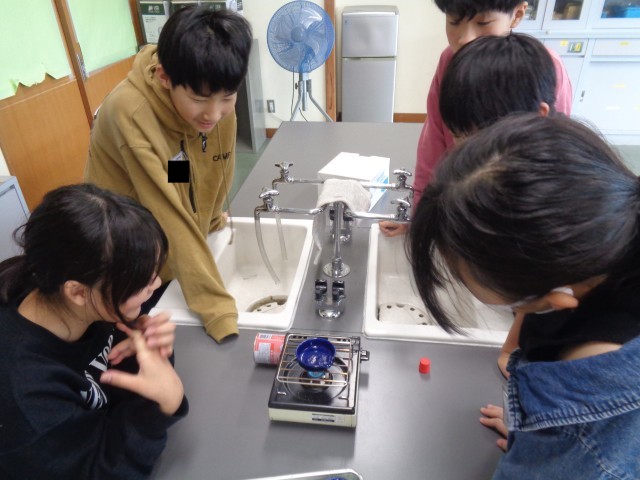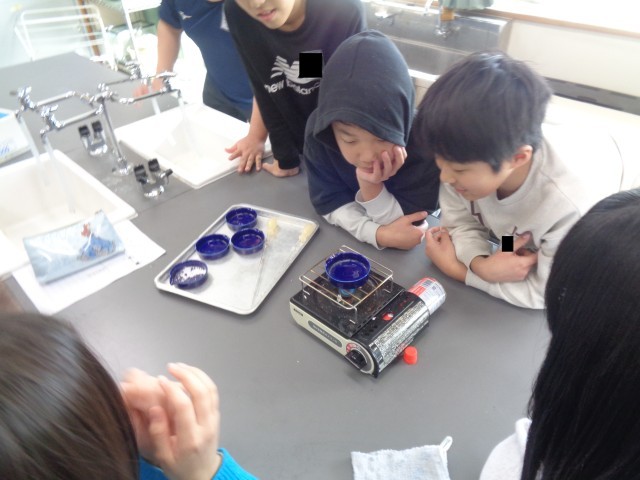 今日の理科では、5つの水溶液を蒸発させて、その水溶液には何が溶けているのか調べました。