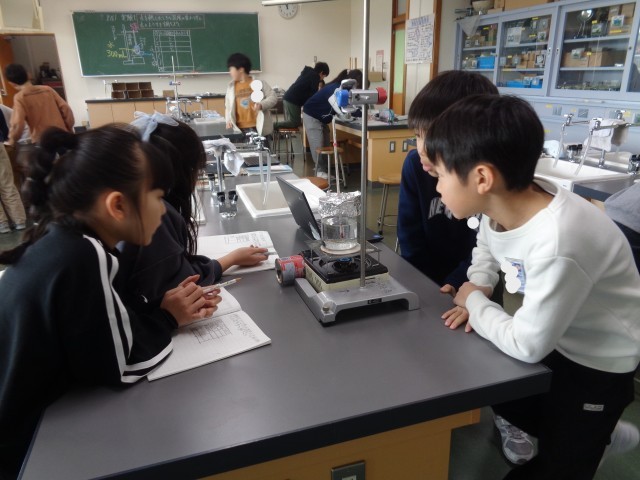 理科では、「水のすがたと温度」の学習をしています。水を熱したときの温度の変化や水の様子を、1分後、2分後、、、と時間の経過とともに記録していきました。班の友達と協力しながら学習に取り組みました。