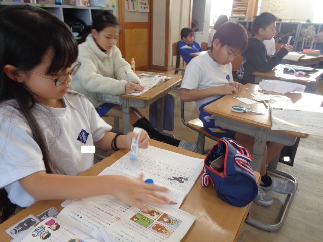 国語の学習では、四枚の絵を使って物語づくりに挑戦しました。