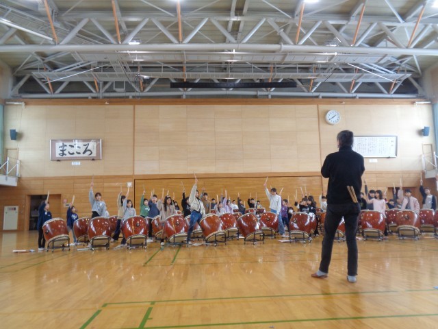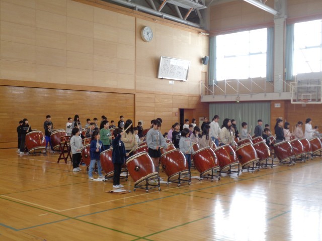 今日の5時間目は全校児童で太鼓げんキッズを行いました。本番の並び方で演奏を聴いていただきました。