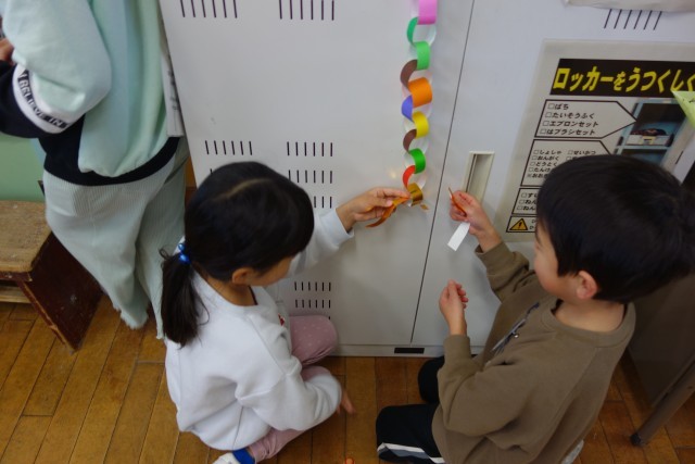 挨拶をして、あいさつの輪をつなげています。少しずつ長くなってきました。