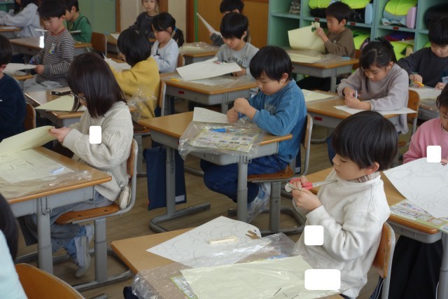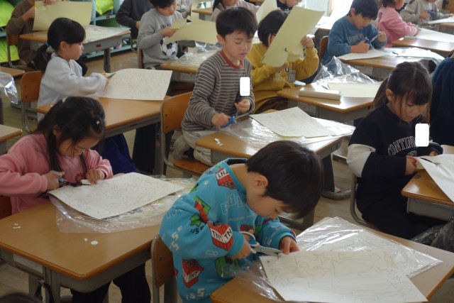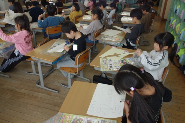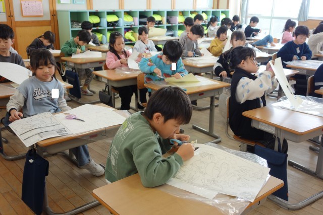 図画工作科のステンシルローラー版画の学習の様子です。黙々と取り組みました。