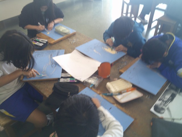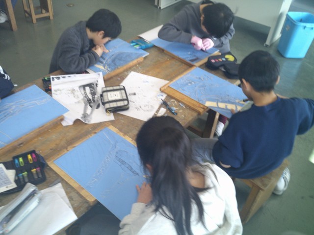 和太鼓を演奏している自分を版画に表します。線を意識して彫り進めました。
