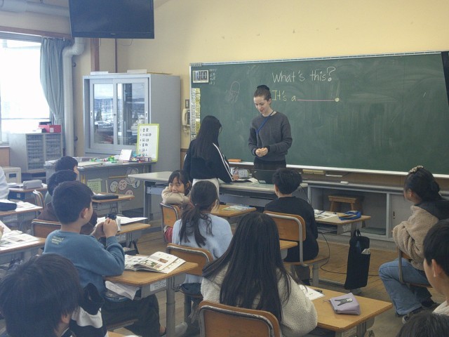 ALTの先生の「What's this?」の問いに、子供たちが、「It's a  cat。」等と答えます。