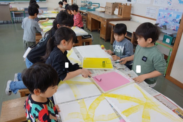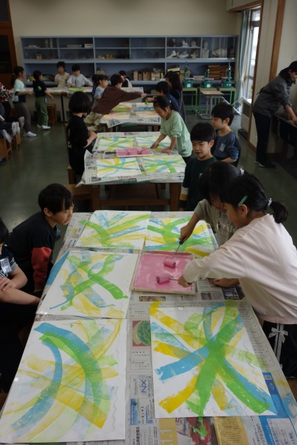 図画工作科の学習の様子です。版画の学習の続きです。今日は、ローラーを使って楽しく着色。