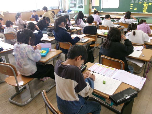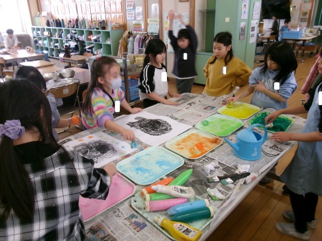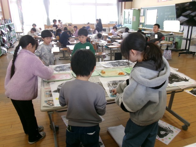 版画の仕上げを行いました。人物の明るい雰囲気を醸し出すため、版画の周りに色を付けました。子供たちは、協力しあって丁寧に着色していました。また、自分の番を待っている子供たちは、静かに自習に取り組んでいました。さすが、2年生です!