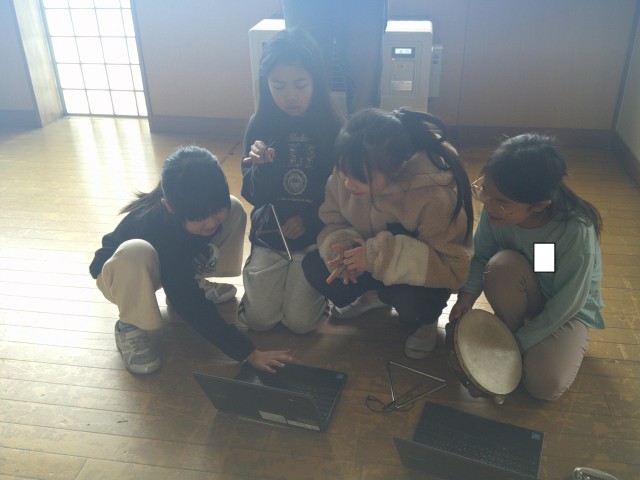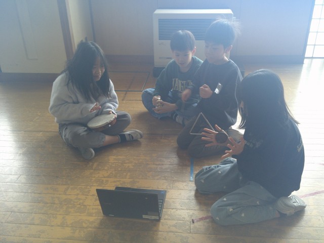 グループで担当する楽器を決め、どのように鳴らすかを考え、実際に楽器を鳴らす活動に取り組みました。