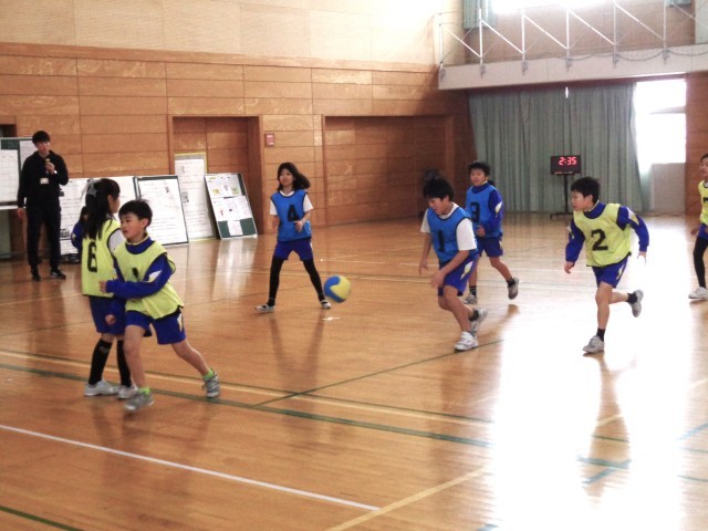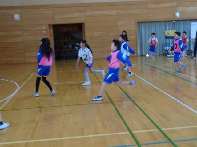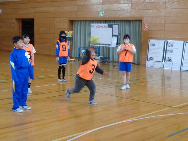 「みんなで協力ハンドボール」の学習に取り組んでいます。ゲームの進め方やルール、反則の種類などを確認して、6チームによるリーグ戦が始まりました。授業では、チームごとに練習をした後、試合にのぞみます。役割を分担したり声を掛け合ったりしながら全力で運動する子供たちです。