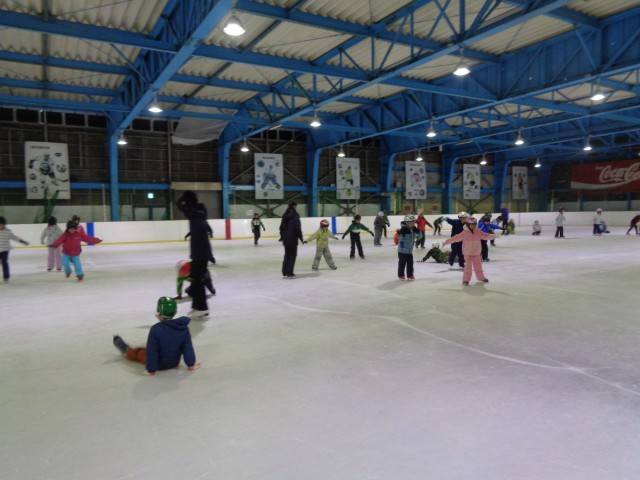 スケート靴を履いて氷の上に立った途端、思ったよりも滑ることに驚いていた子供たち。
