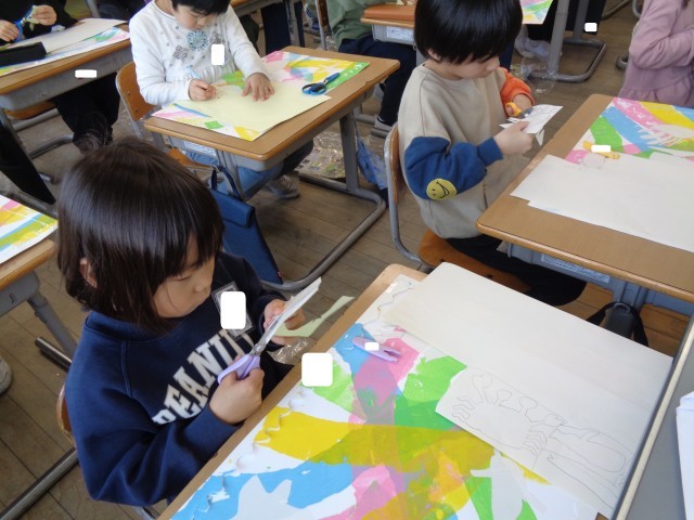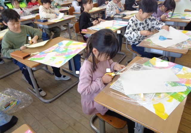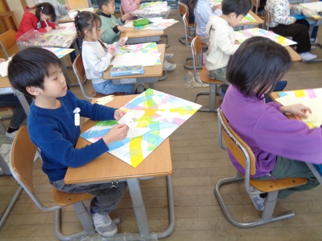 1年生 図工 ステンシル版画 公開日 2026/02/03 更新日 2026/02/03 1年生 図工の時間では、版画制作の続きをしました。今日は、シールを自分の好きな海の生き物のかたちに切り取って、画用紙に貼り付けました。完成まであと少しです。 +1