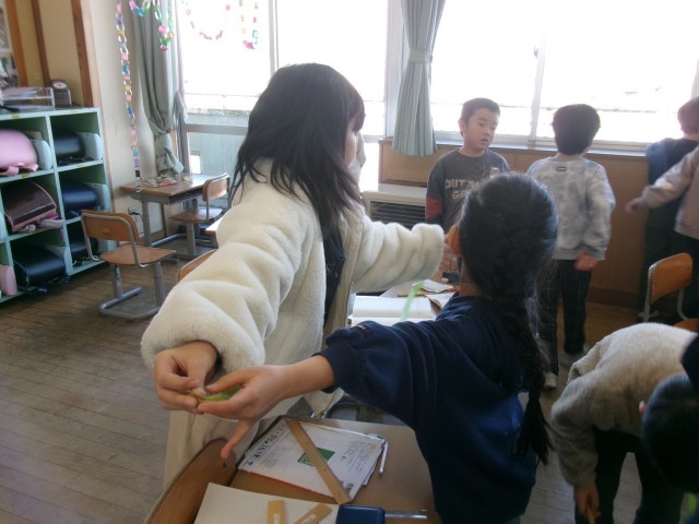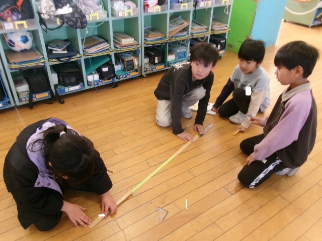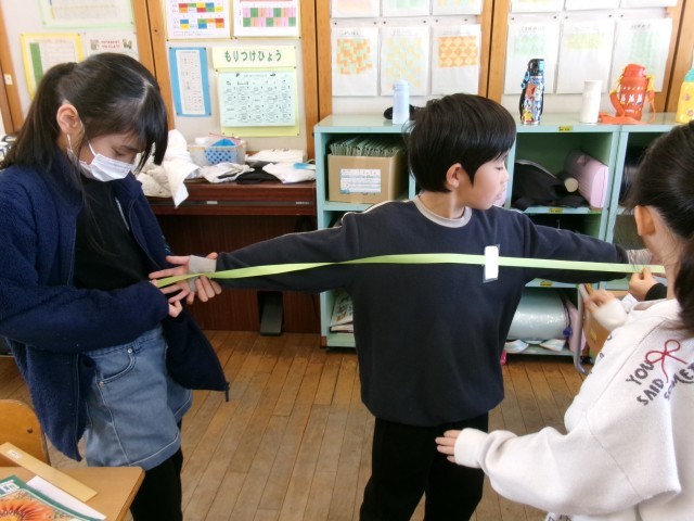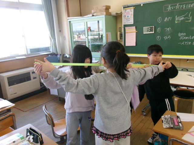 自分の体の長さを測って「長さ」の単元の導入としました。昔の人が活用した「あた(親指と人差し指を広げた長さ)」「つか(グー=手を握った長さ)」「ひろ(両手を広げた長さ)」を実際に測って、子供たちは自分の長さを知ることができたようです。なんと、「ひろ」は大体、自分の身長と同じぐらいの長さだということが分かって、子供たちはびっくりしていました。