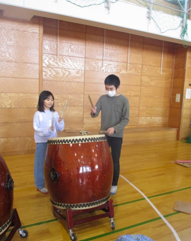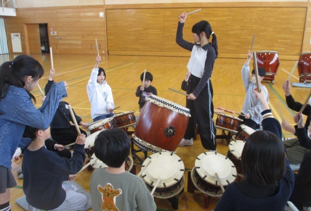 卒業までに4年生が「大地」「大祭」を演奏できるよう、叩き方やリズムを一生懸命に伝えました。