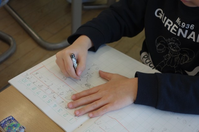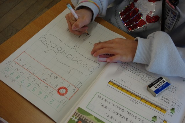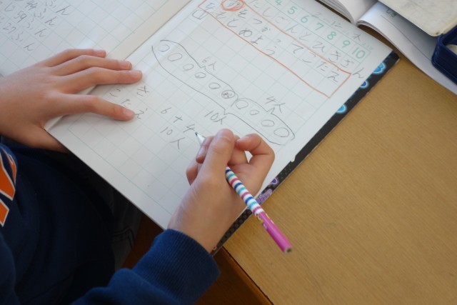 算数科の学習の様子です。「たしざんとひきざん」の学習ですが、これまでとは一味違います。ノートに図を描き、立式したり答えを求めたりしました。
