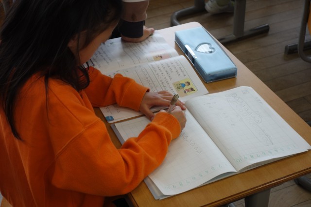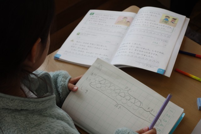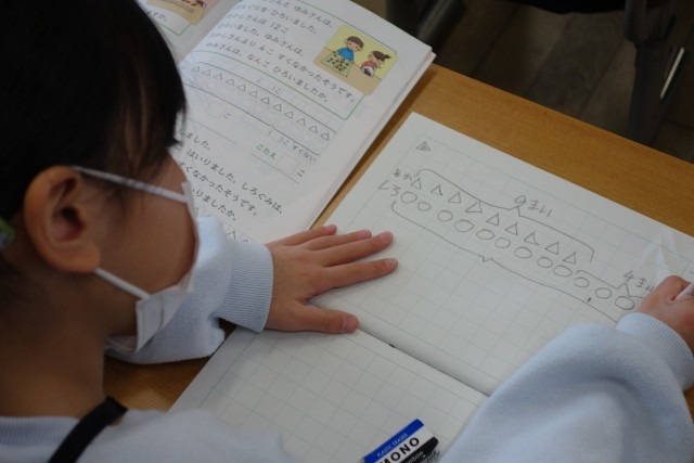 算数科の学習の様子です。ノートに図を描き、答えを求めます。少しずつ慣れてきたようです。