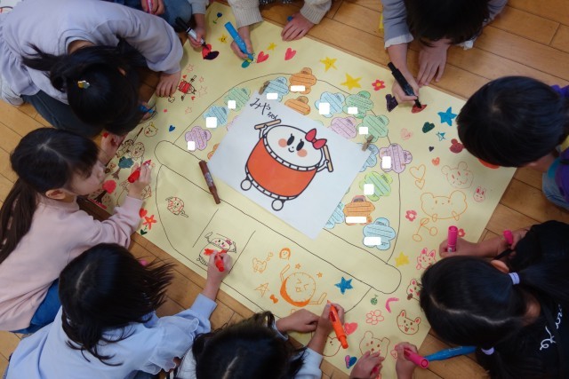 5年生の呼びかけに応じて、メッセージ花かごをつくっています。心を込めてメッセージを書いた子供たち。花かごの周りにも、イラストを描き、子供たちなりに「ありがとう」の気持ちを表現しました。