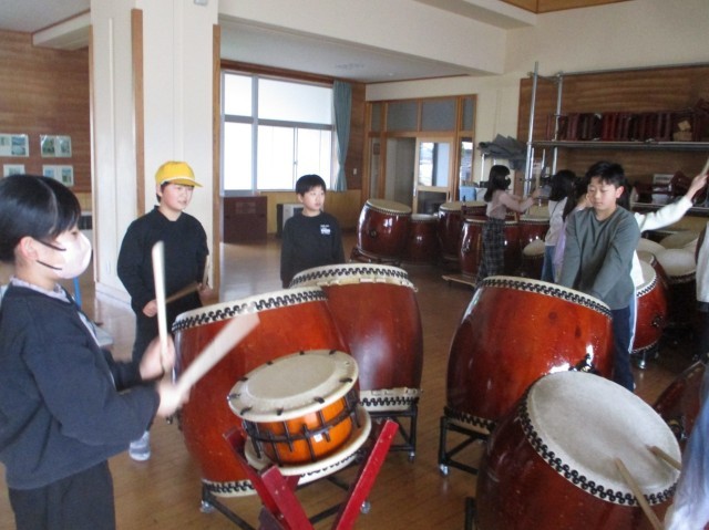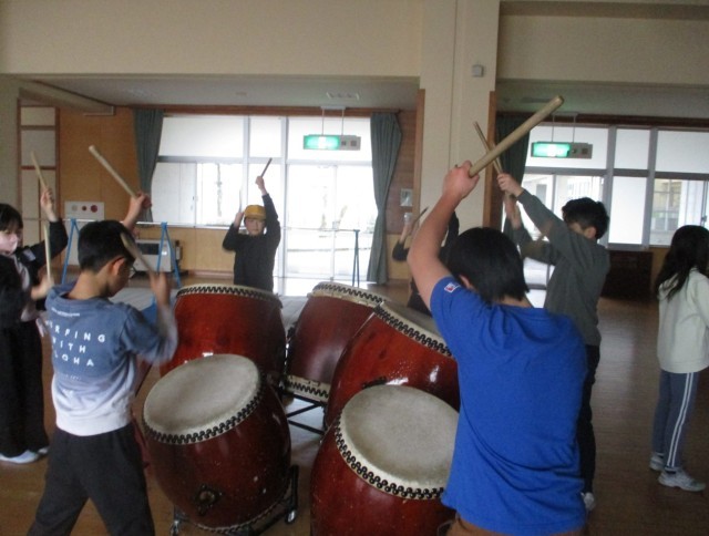 朝の時間に、4年生に太鼓の演奏を教える6年生の姿が見られました。