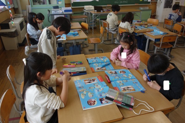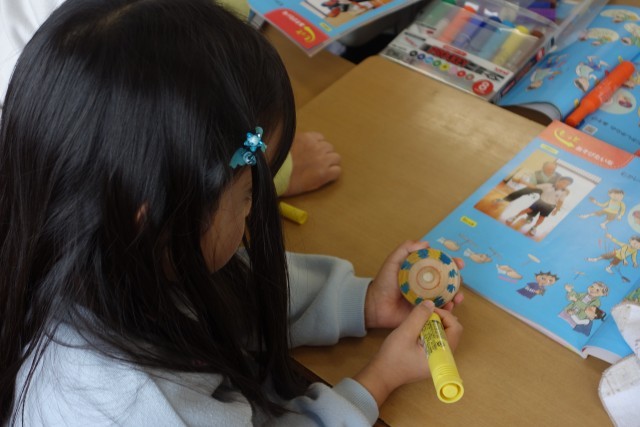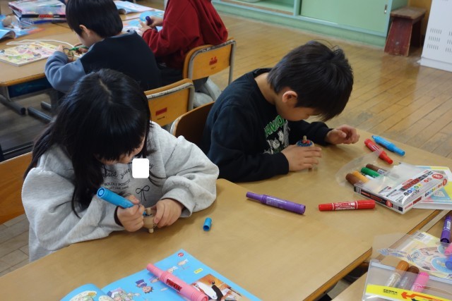 生活科の学習の様子です。こまに模様を描き、オリジナルごまに。
