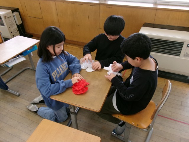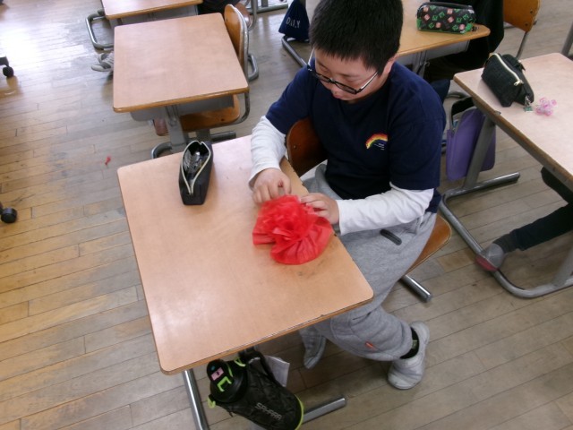 今日の図工では、卒業式に向けて紅白の花を作りました。ペアになり教え合いながら作りました。
