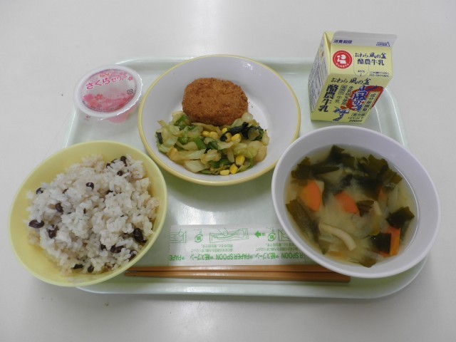 献立名:赤飯 牛乳 とんかつ コーン和え みそ汁 お祝いゼリー