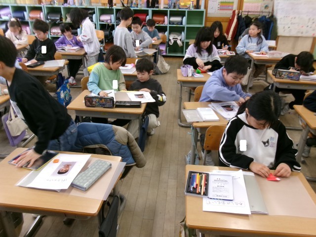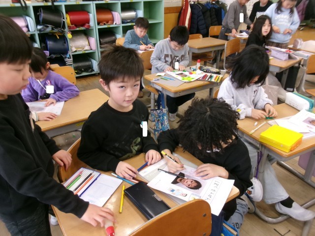 生活科「わたし たんけん」の表紙づくりを行いました。子供たちは、先日撮影した現在の「顔写真」の周りにイラストを描いたり、折り紙で模様をつけたりして、華やかな雰囲気を醸し出していました。もうちょっとで完成です。