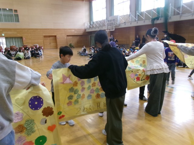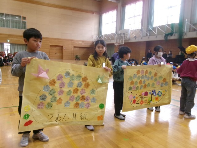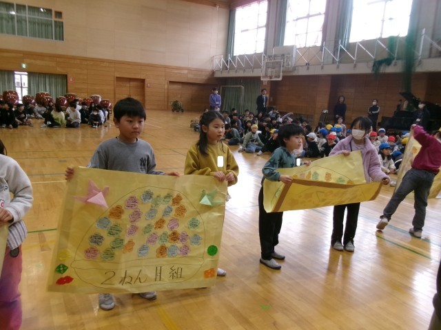 2年生の代表児童が、お世話になった6年生にメッセージカードを渡しました。