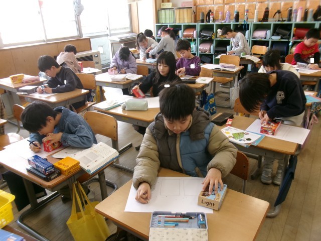 子供たちは、箱の形を画用紙に写して、切り取り、「面の数」を調べました。家から持ち寄った箱をくるくる回して、楽しそうに作業していた子供たちです。次回は、切り取った形を「はこ」に組み立てます。果たして、箱になるのでしょうか。楽しみです。
