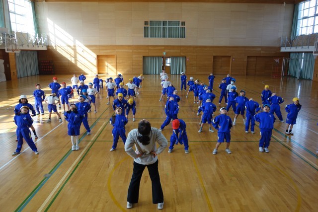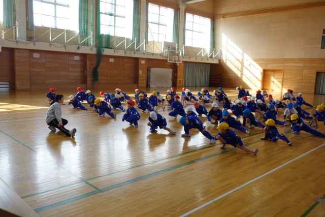 体育科の学習の様子です。先生の動きをまねっこ。楽しく学習しました。