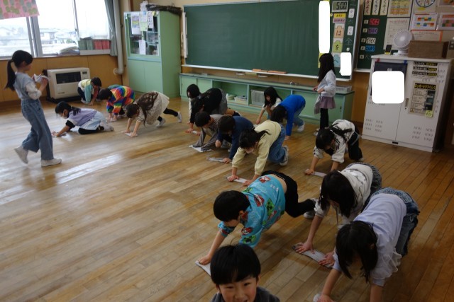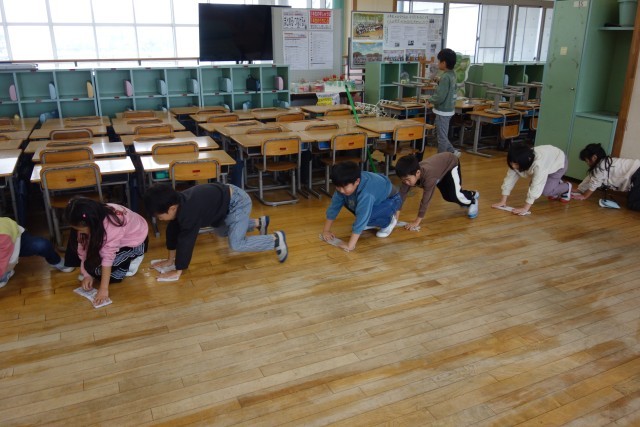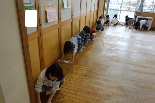 放課後のワックスがけの前に、大掃除。何度も水拭きして、床をピカピカにしました。働き者の子供たち。あっという間にきれいになりました。