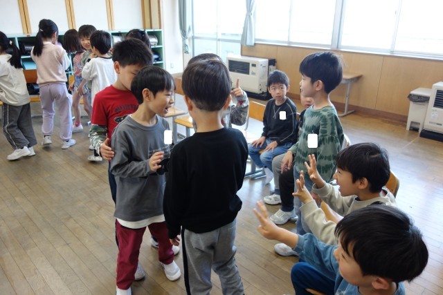 国語科の学習の様子です。言葉は出さずにジェスチャーのみで、誕生日順に並びます。