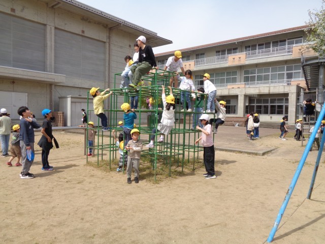 今日の3時間目の体育は、6年生さんが遊んでくれました。はじめに「こおりおに」をしました。手加減して追いかけたり、不安な気持ちになっている1年生に手を取って一緒にいてくれたりしました。そのあとはジャングルジムにのぼったり、ブランコを後ろから優しく押してくれたりしました。あとから感想を聞くと、「6年生さんがやさしかった」「一緒に遊べて楽しかった」と話していました。6年生さんと触れ合うことで、1年生は6年生をとても頼もしく感じていました。