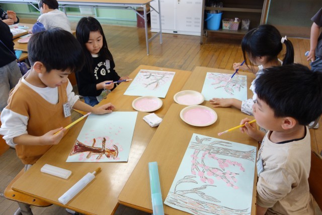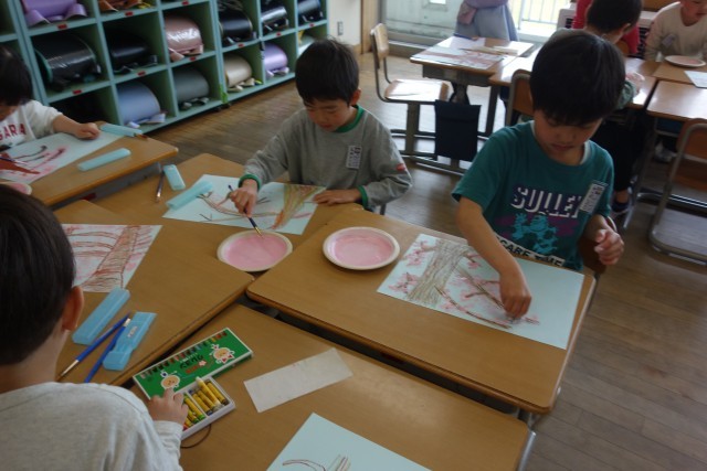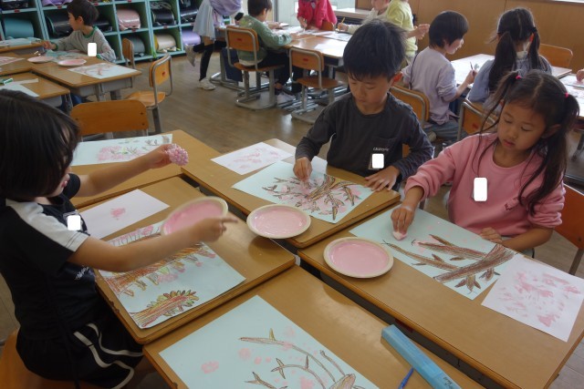 図画工作科の時間の様子です。前回描いた木の幹や枝に、桜の花を描きました。