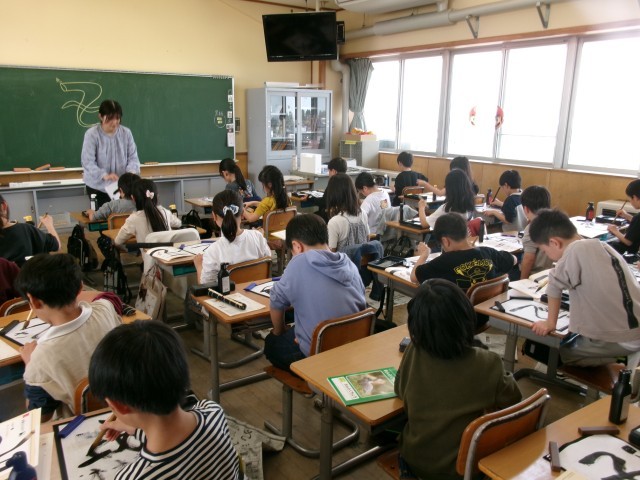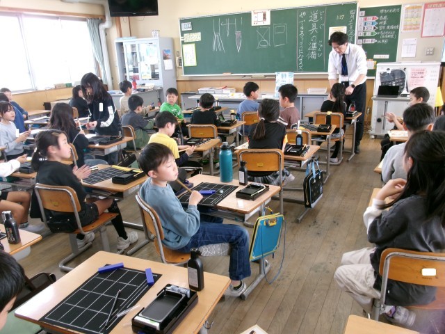 3年生になって、初めての書写(習字)の時間です。今日は、道具の置き方や筆の使い方、そして、準備や後片付けの仕方などを学習しました。早く本格的に習いたい子供たちでした。