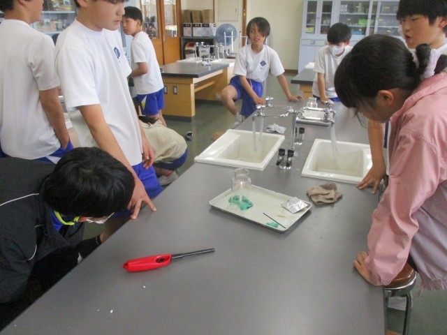 集気びんの中で燃えるびんの周りの空気の動きを観察しました。